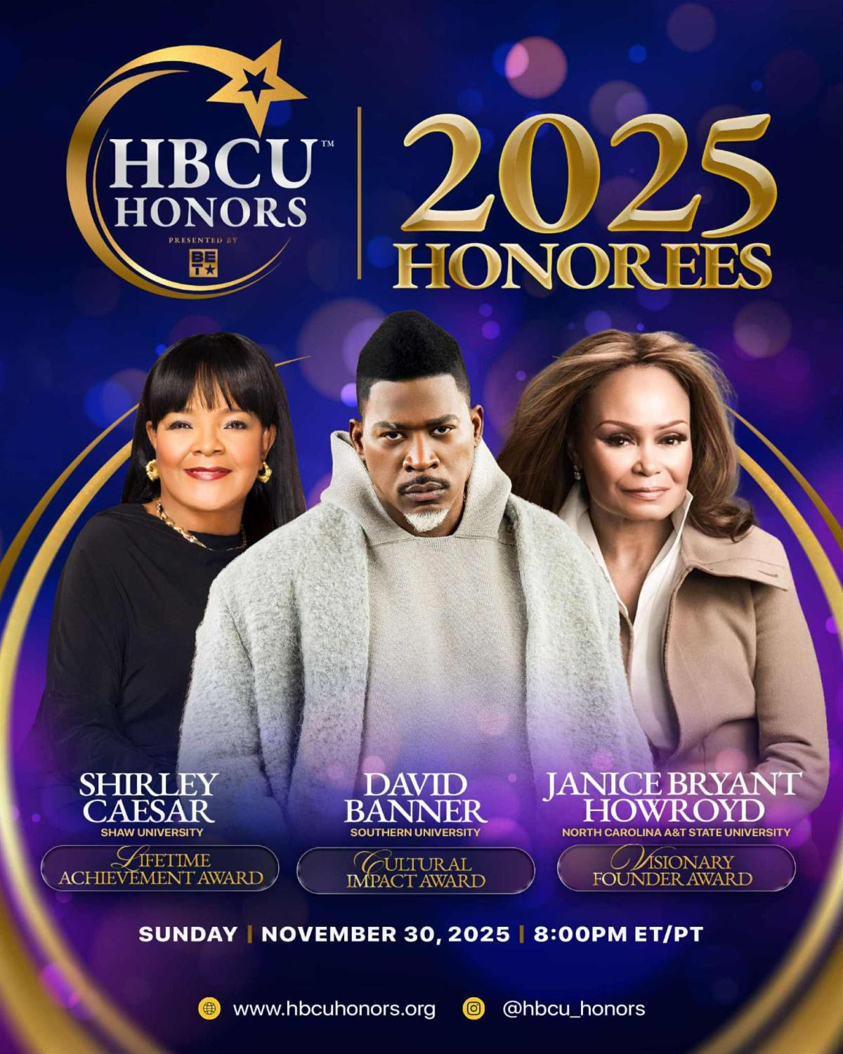 WASHINGTON, D.C. — November 7, 2025 — The 2025 HBCU Honors Presented by BET returns Thanksgiving weekend with a powerful celebration of Black excellence, leadership, and legacy premiering on Sunday, November 30 at 8 PM ET/PT on BET and BET Her. This year’s honorees — Pastor Shirley Caesar (Shaw University), David Banner (Southern University), and Janice Bryant Howroyd (North Carolina A&T State University) — embody the strength, innovation, and spiritual foundation that continue to define the legacy of Historically Black Colleges and Universities (HBCUs).
